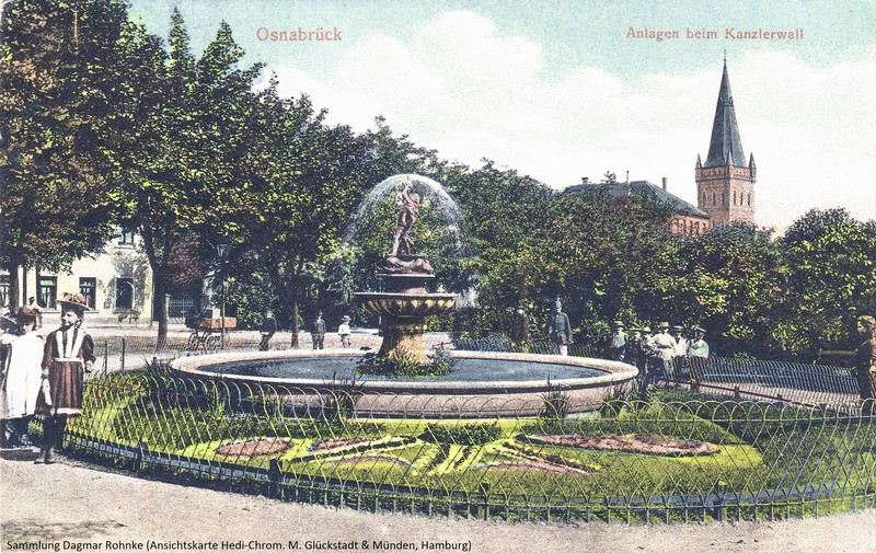 Ich merke schon, Sie haben Fragezeichen in den Augen. So ging es mir auch. Denn der Ort dieses Springbrunnens ist kaum noch vorstellbar, wenn man die Gegebenheit heute kennt. Also rollen wir die Geschichte rückwärts auf. Sie kennen sicherlich das Galeria Kaufhof Gebäude an der Ecke Wittekindstraße/Möserstraße! Davor war es Horten. Vorher war es seit 1903 das Hotel Germania von Eduard Petersilie. Und noch früher das Hotel-Drei-Kronen. Dieses Hotel wurde im Jahre 1894 von Albert Drüge übernommen, der die Außenanlagen, die bis zur Hase reichen in einen Lustgarten umgestaltete. Das muss ein besonders großes Arreal gewesen sein. Baute er doch Veranden, Wandelgänge und Vogel- und Tiergehege. Unter anderem gab es auch eine Bühne für Konzerte und einen Bootsanleger, der Ruderbootsfahrten auf der Hase ermöglichte. Und mitten im Konzertgarten war ein großer Springbrunnen, der für gekühlte Luft sorgen sollte.